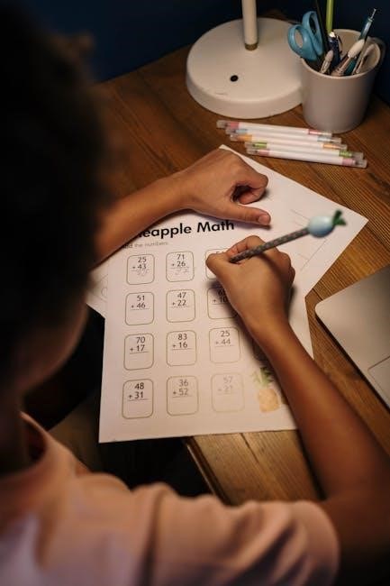 Printing the worksheet is straightforward and ensures you have a physical copy for practice. Once downloaded, open the PDF file using a PDF reader. Select the print option from the file menu or use the keyboard shortcut Ctrl+P. Choose your preferred printer and adjust settings like page orientation to ensure proper alignment. The worksheet is designed to fit standard paper sizes, making it easy to print. Ensure your printer has enough ink and paper before starting. The clear layout and large text make it ideal for students to work on. Printing the worksheet allows for a tactile learning experience, helping students focus on converting mixed numbers to improper fractions effectively. This step is crucial for offline practice and reinforces the concepts learned digitally.